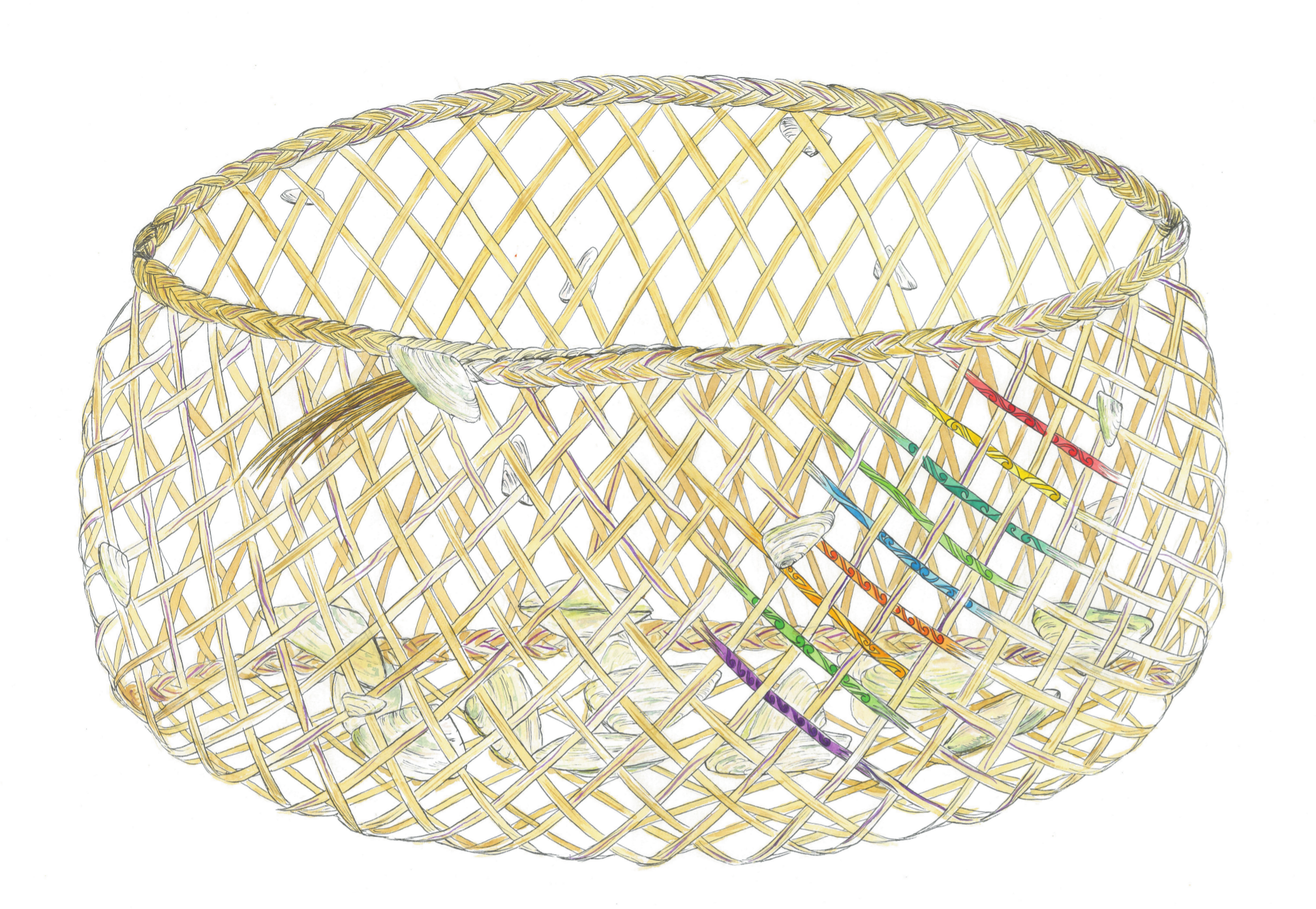I nga wā o mua (in days gone by) our kai collectors would often use open weaved kete (flax baskets) to collect Kaimoana (Seafood). When collecting pipi over the course of an hour or two, the kete would not be withdrawn from water. The open weave would allow for water to flow through, keeping the pipi alive, respecting the mauri of this taonga, and ensuring fresh delicious kaimoana for the whanau (family). The open weave would also allow for the small pipi to pass through. Back to be nurtured in the sand, for there is no respect to remove the pepe (babies) from the Pipi bed.